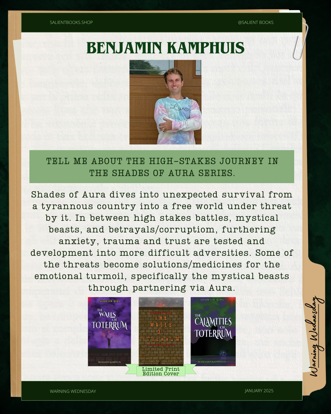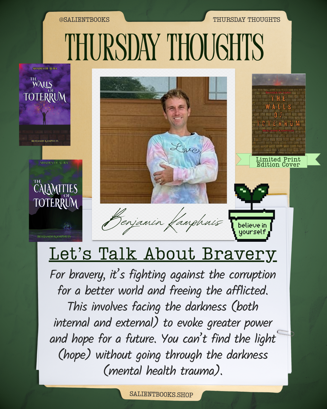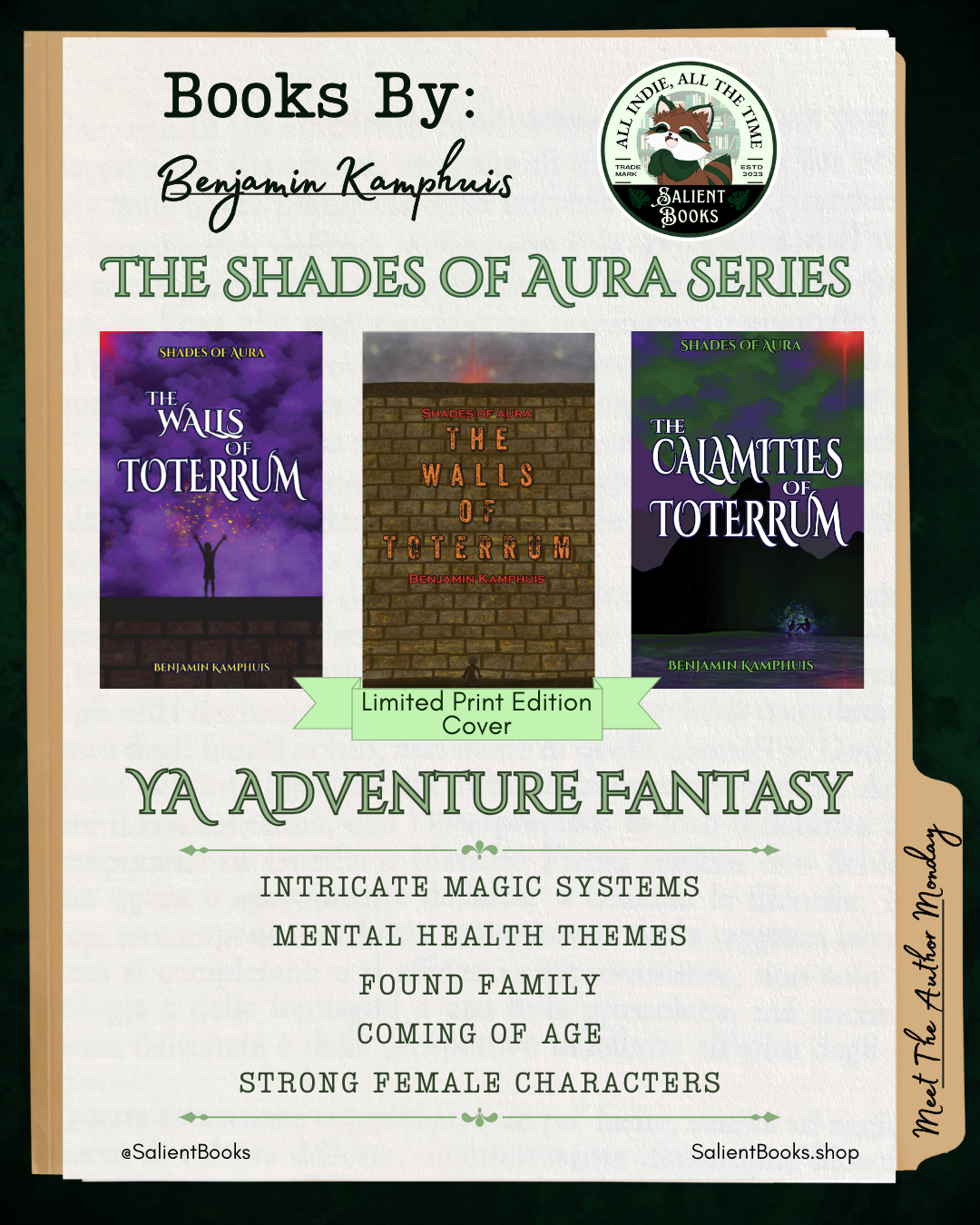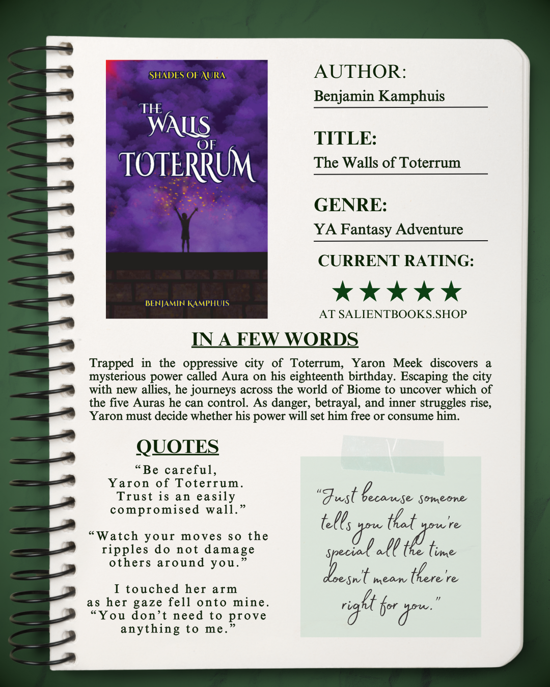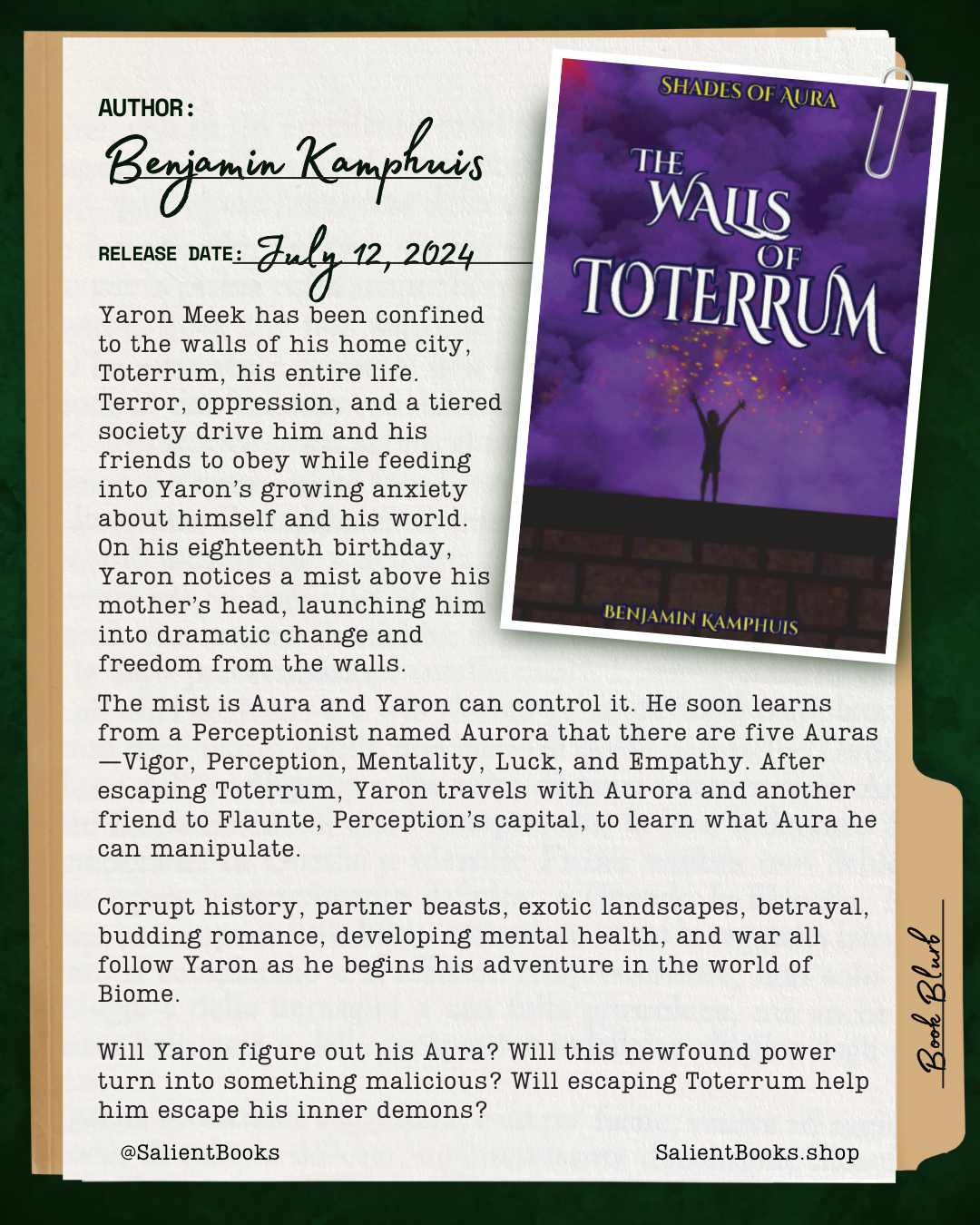 Yaron Meek has been confined to the walls of his home city, Toterrum, his entire life. Terror, oppression, and a tiered society drive him and his friends to obey while feeding into Yaron’s growing anxiety about himself and his world. On his eighteenth birthday, Yaron notices a mist above his mother’s head, launching him into dramatic change and freedom from the walls.