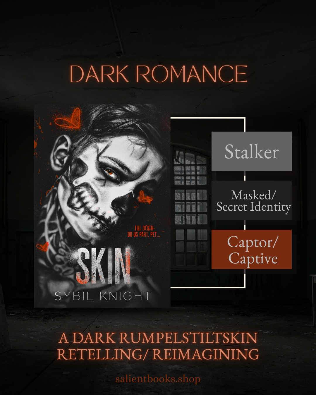 SKIN is a dark Rumpelstiltskin retelling and book one in The Renegades Series. Each title is a standalone in an interconnected world while each story is a retelling of a fairy tale, nursery rhyme, fable, etc. The focus is dark romance so please heed the trigger warnings at the beginning of every book.